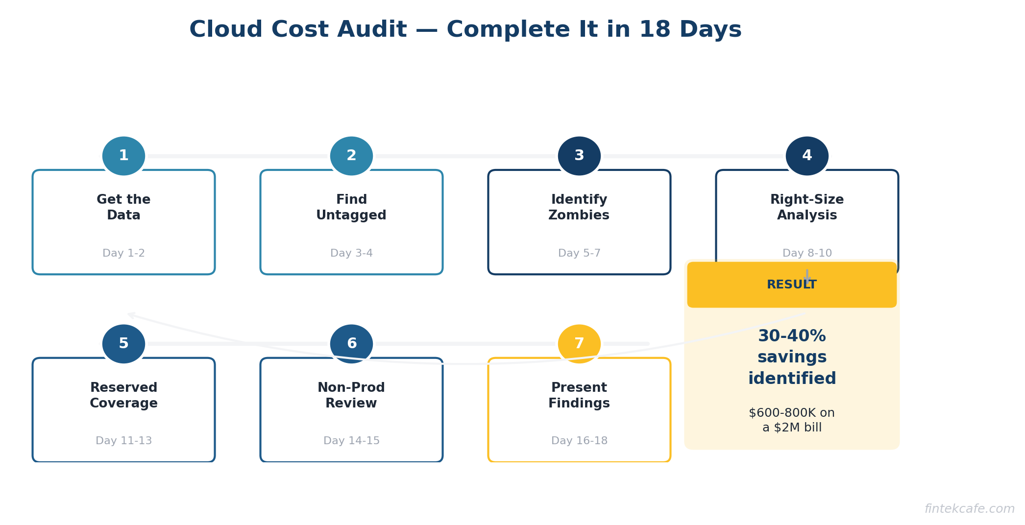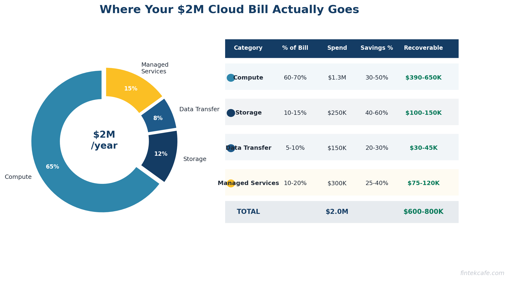 - Most organizations waste 30-40% of their cloud spend. For a $2M annual bill, that is $600K-$800K in recoverable waste.