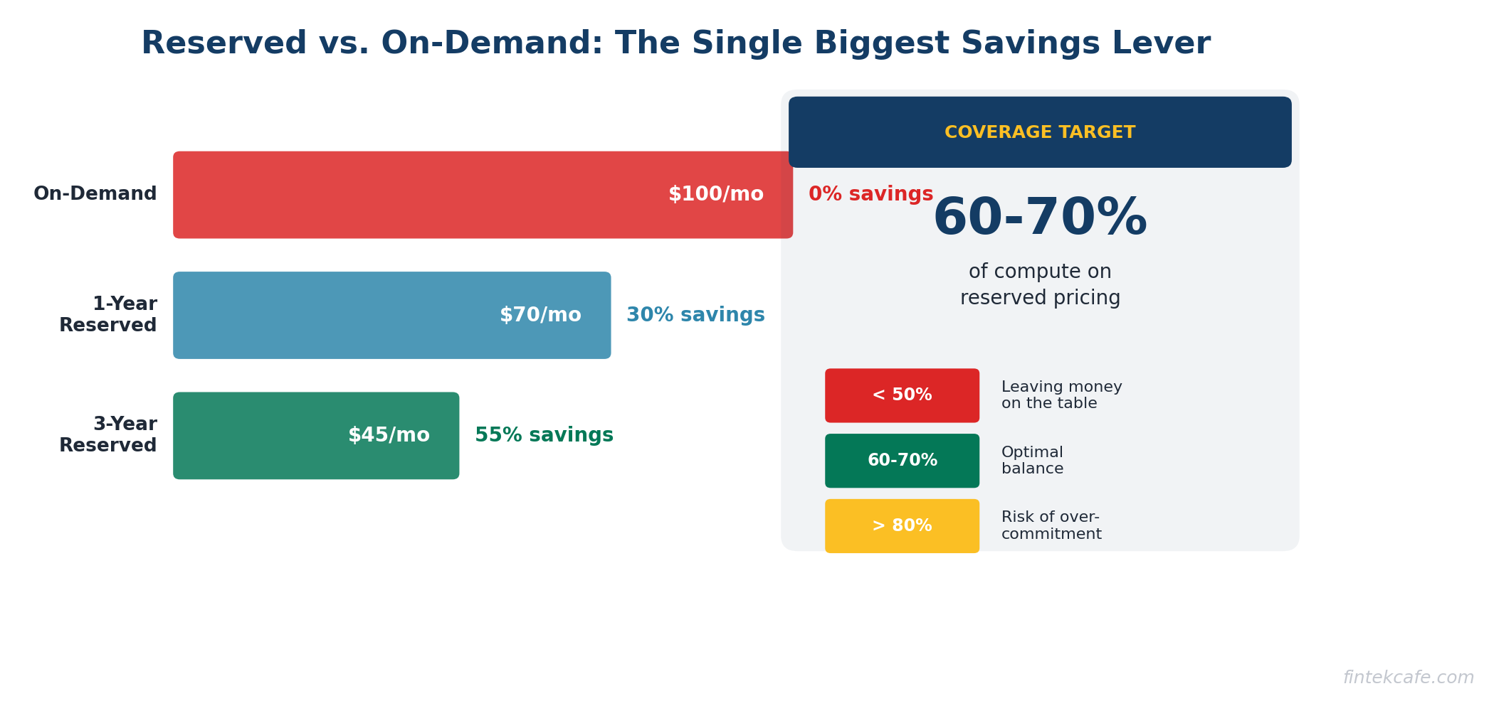 An on-demand instance costs $100/month. A one-year reserved instance costs $70/month (30% savings). A three-year reserved instance costs $45/month (55% savings).