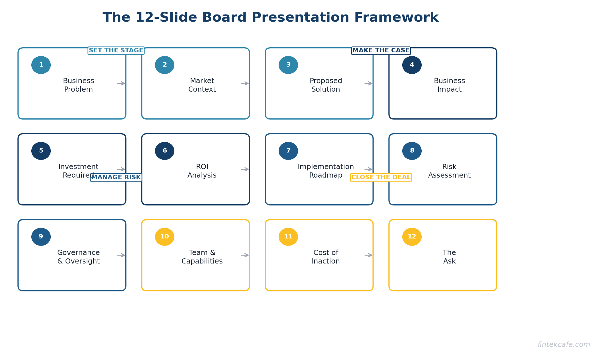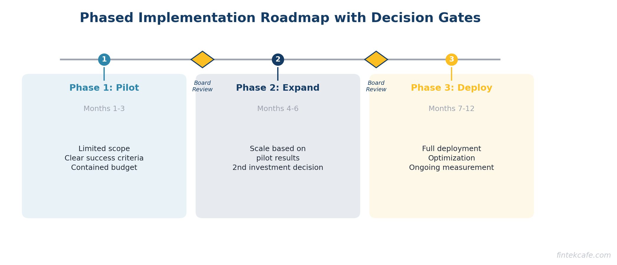 - Show a phased roadmap with clear decision gates so the board can adjust course without being locked in.