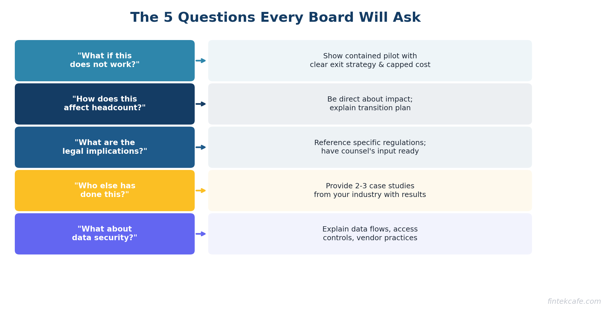 - Prepare for the five questions every board asks: What if it fails? What about headcount? What are the legal risks? Who has done this before? How is data protected?